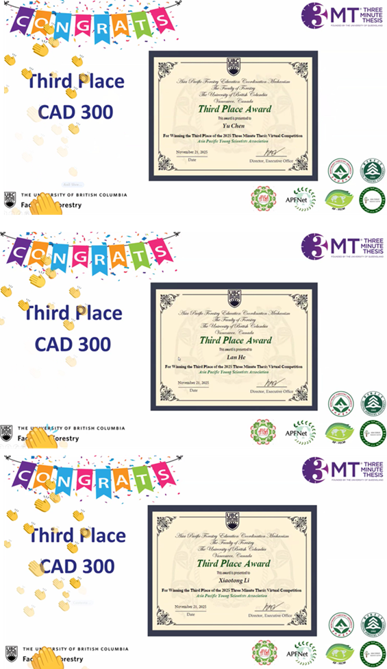 On November 22, 2025, at the 2025 Asia-Pacific Young Scientists Association (AYSA) Three Minute Thesis (3MT) Final, three outstanding graduate students from the College of Materials Science and Engineering, Yu Chen, Lan He, and Xiaotong Li, earned Third Prize among 38 exceptional early-career researchers from 16 institutions across 9 countries. Their remarkable performance not only demonstrated the academic strength and global competitiveness of our students, but also highlighted the impact of their research, spanning bio-based innovations in water harvesting, advancements in wood functionalization, and furfural-derived photoinitiators for sustainable additive manufacturing.